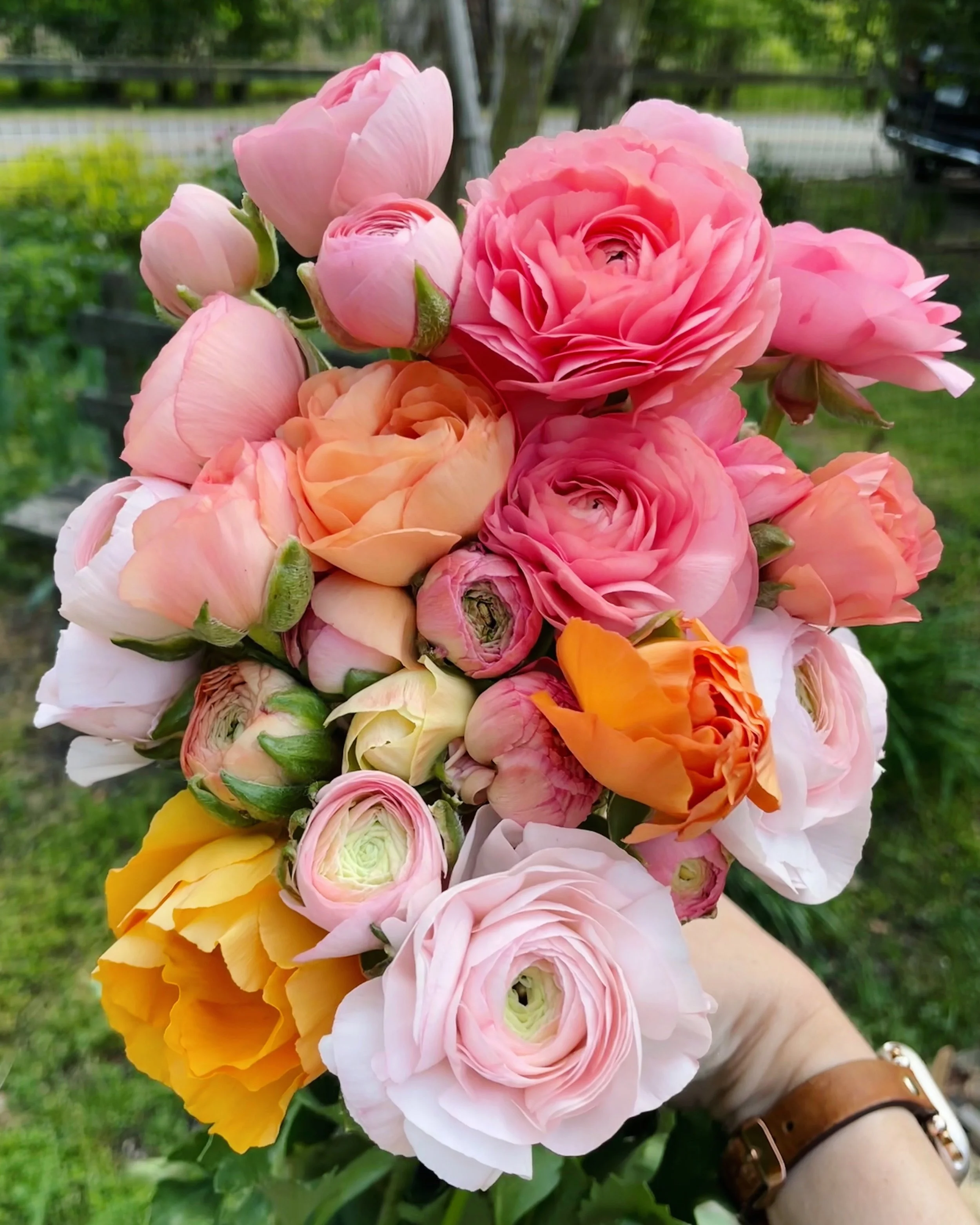 A colorful bouquet of various pink, peach, yellow, and white flowers being held by a person with a brown wristwatch, outdoors with green grass and trees in the background.